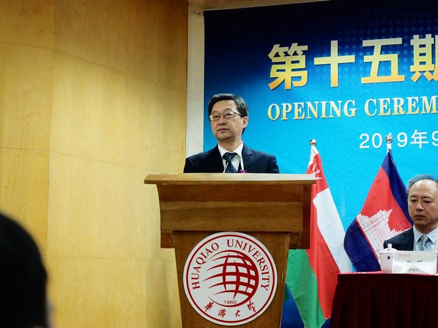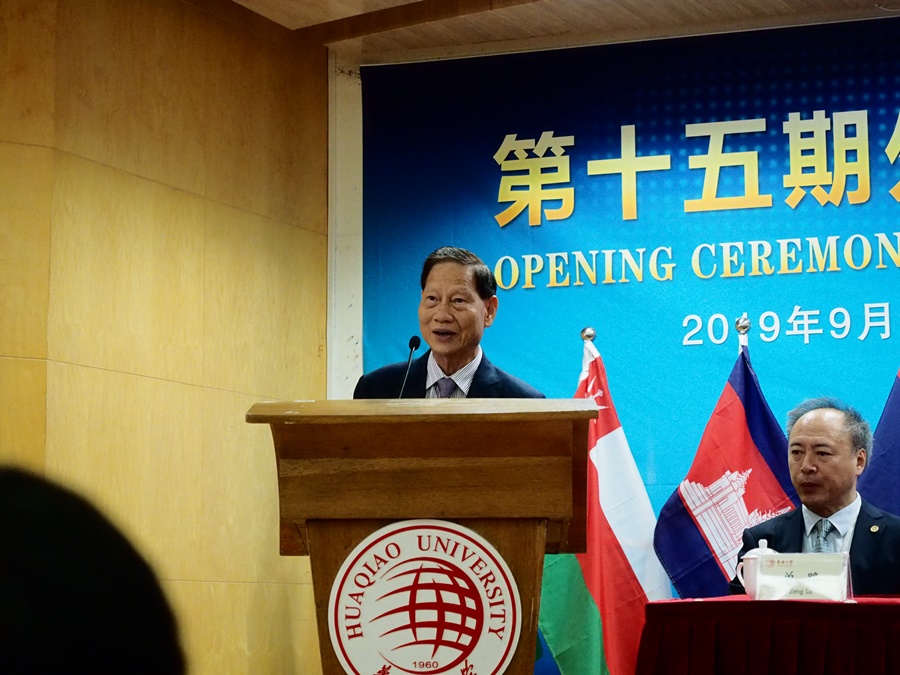 开学典礼在华侨大学厦门校区王源兴国际会议中心举行。泰国泰中文化经济协会副会长张祥盛,老挝总理府党与人事司司长孔山?赛亚山,泰国驻厦门总领事馆总领事甘迪满,菲律宾驻厦门总领事馆文化官  艾诺伊,华侨大学校长徐西鹏等出席并为学员们佩戴校徽。华侨大学副校长曾路主持开学典礼。